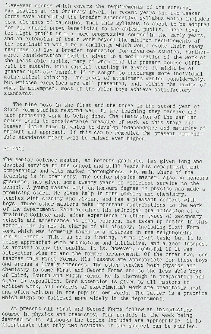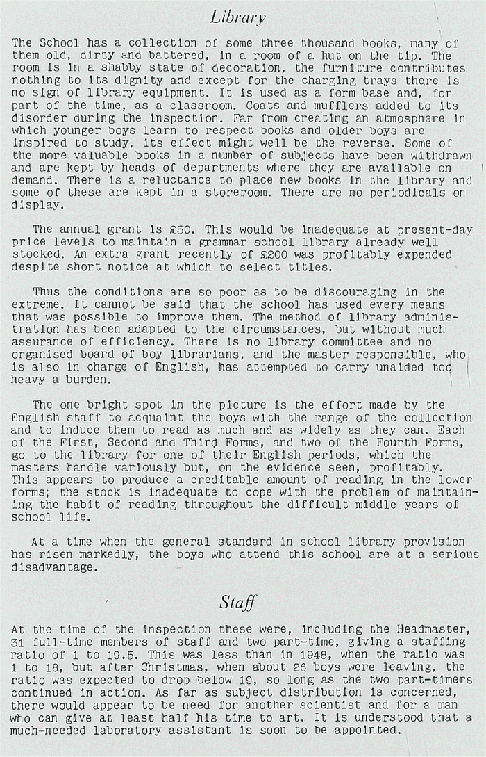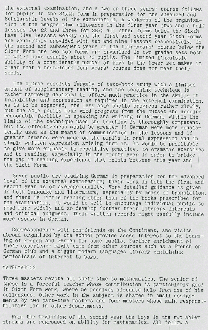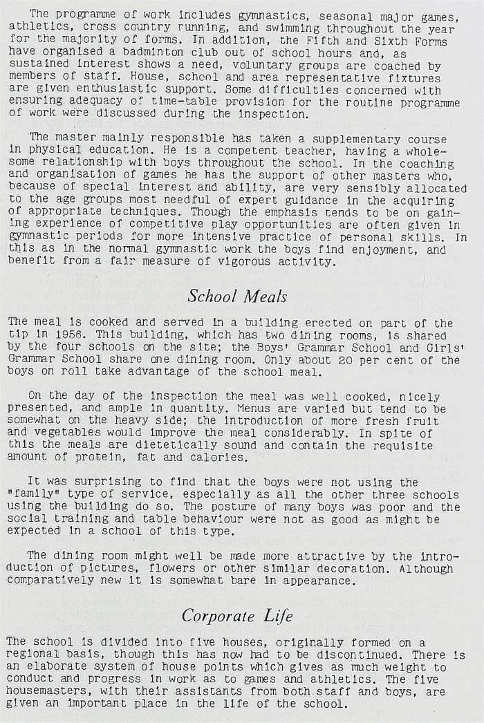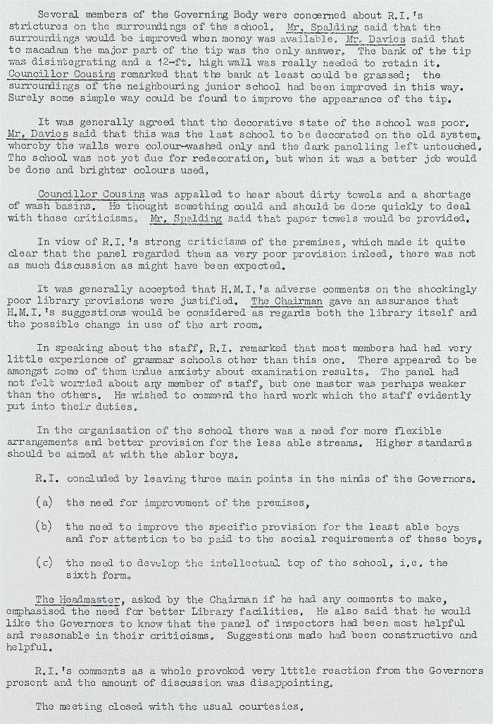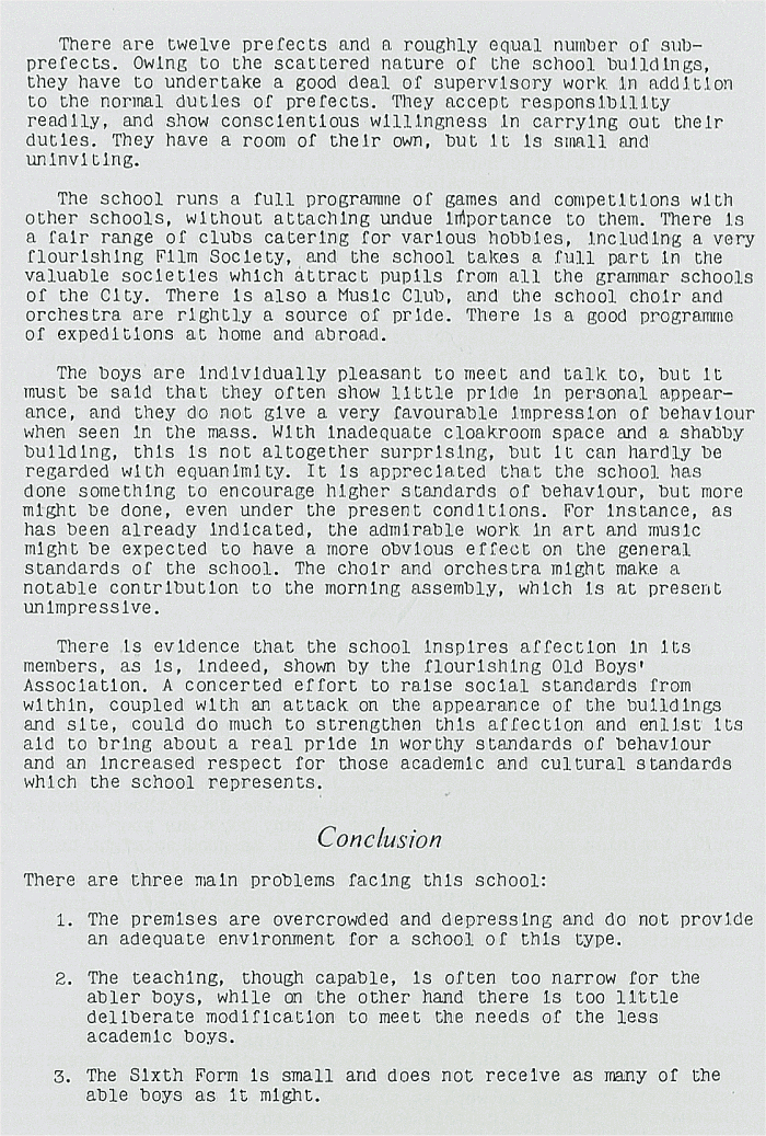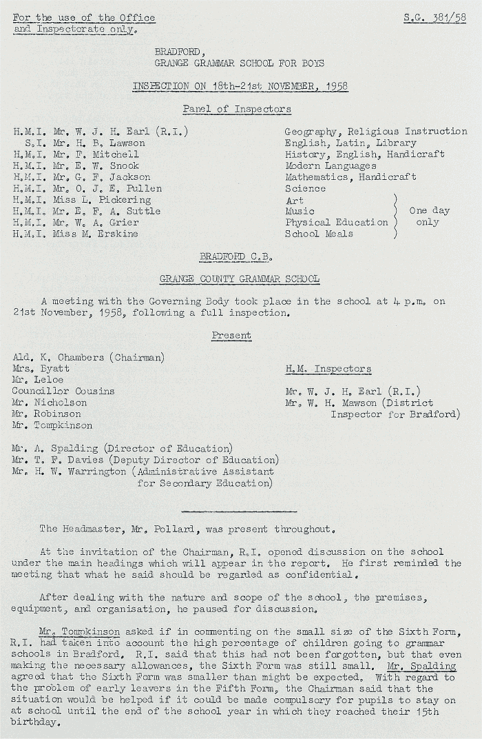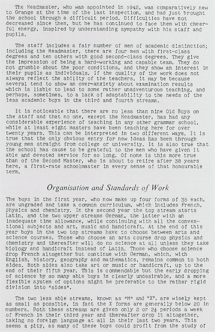 A report by HM Inspector of Schools following an inspection of Grange Boys' Grammar School in November 1958 (kindly supplied by Alan Duckworth)