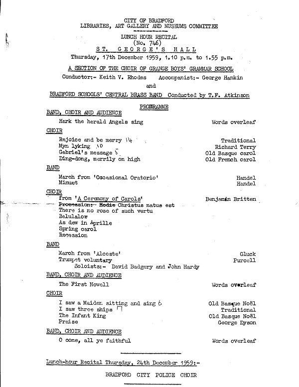 The following copy of the programme for the choir's Lunch Hour Recital at St George's Hall, Bradford on 17th December 1959 was kindly donated by Harry Atkinson
