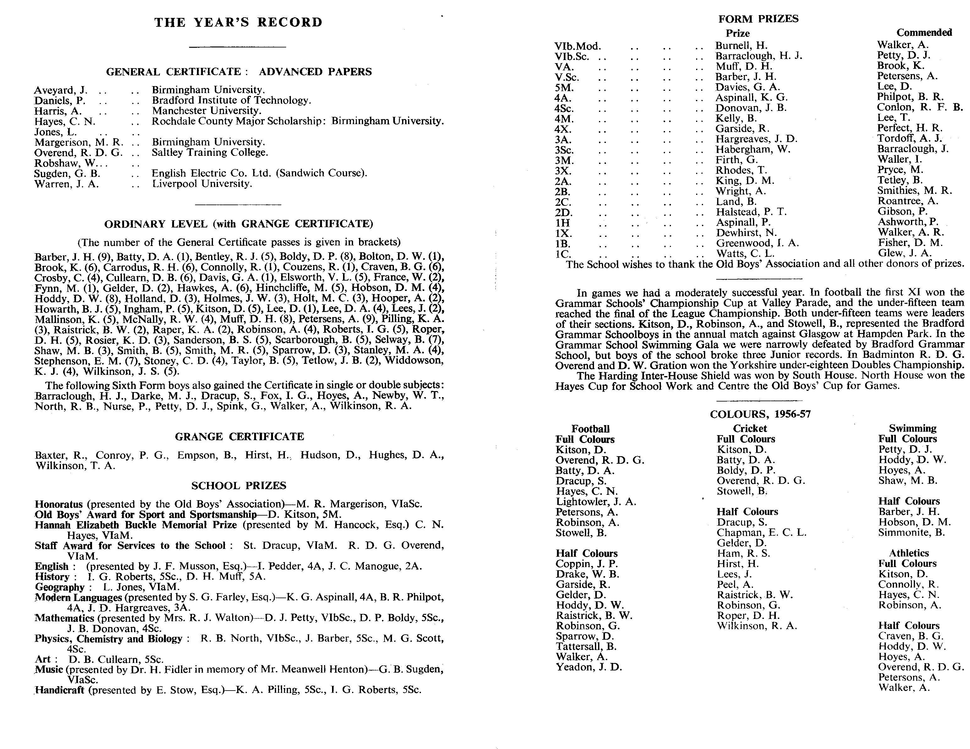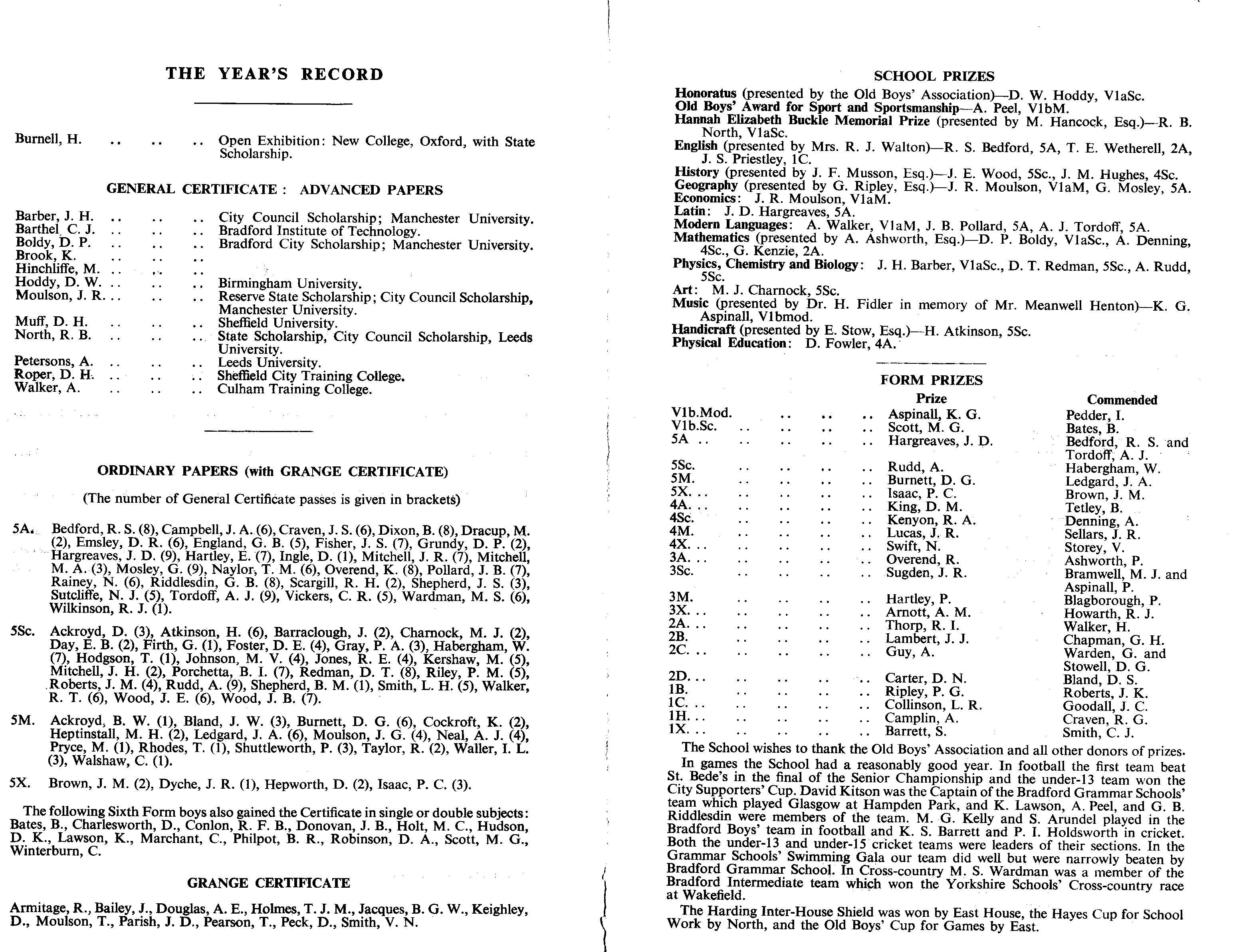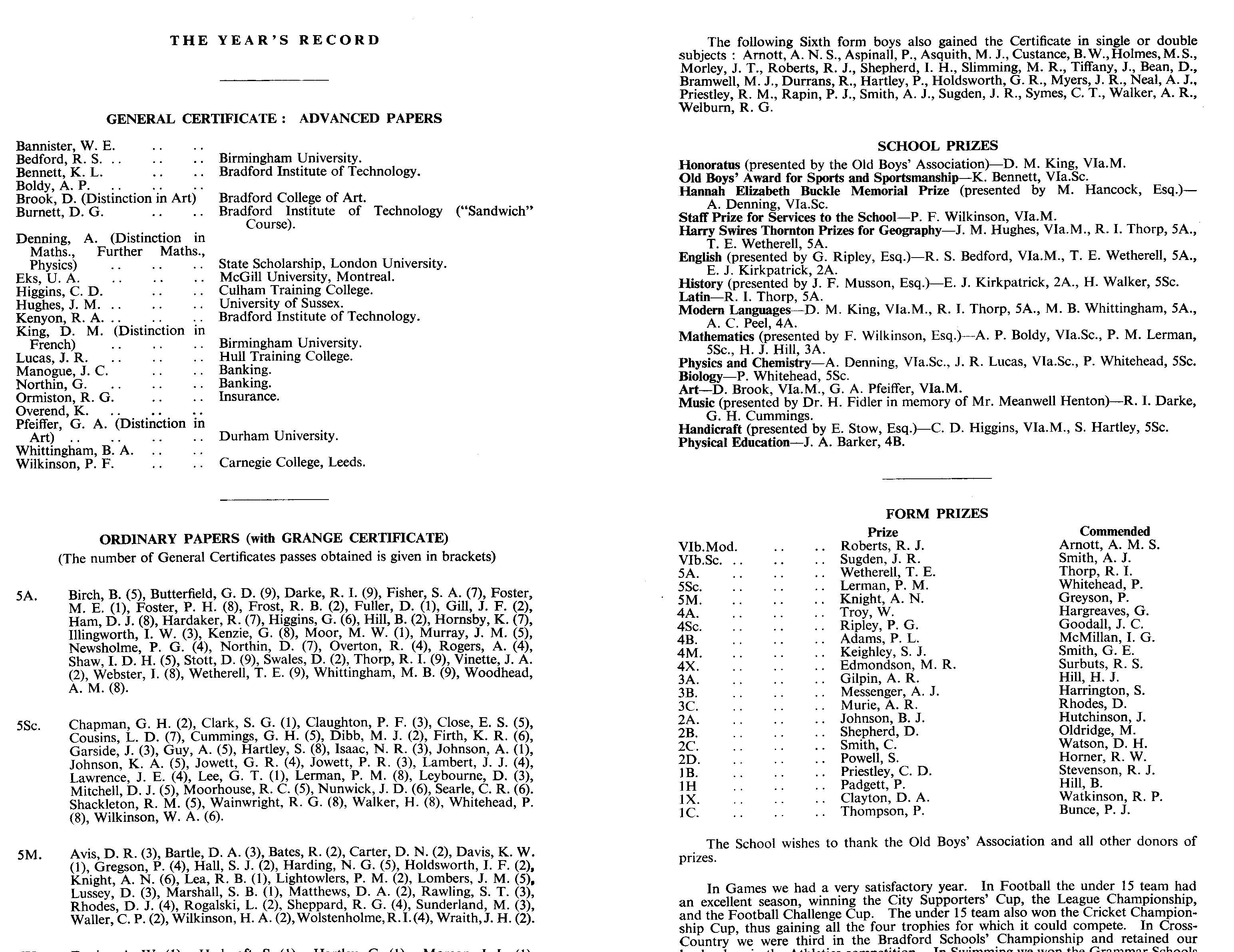 Arnott, AMS - Insurance; Birch, B - Third Year Sixth; Butterfield, GD - Birmingham Training Coll; Cummings, GH - 3rd Yr 6th; Darke, RI (‘A’ in Music) - Bristol University; Ham, DJ - Leeds University; Hardaker, R - Insurance; Hornsby, K - Insurance; Kenzie, G - Birmingham University; Lawrence, JE - Leeds Training Coll; Northin, D - Insurance; Shaw, IDH - Leeds Law School; Sheppard, RG - Culham Training Coll; Stott, D - Insurance; Thorp, RI ( ‘A’ in Latin, French & German) - Leeds University; Walker, H (Distinction in Economics, Special Paper) - Third Year Sixth; Wetherell, TE - Keele University; Whittingham, MB (‘A’ in Geography and French) - Leeds University; Woodhead, AM - Westminster Bank.